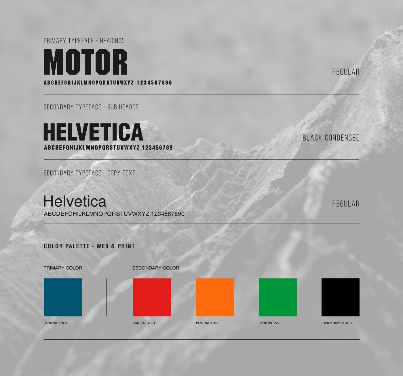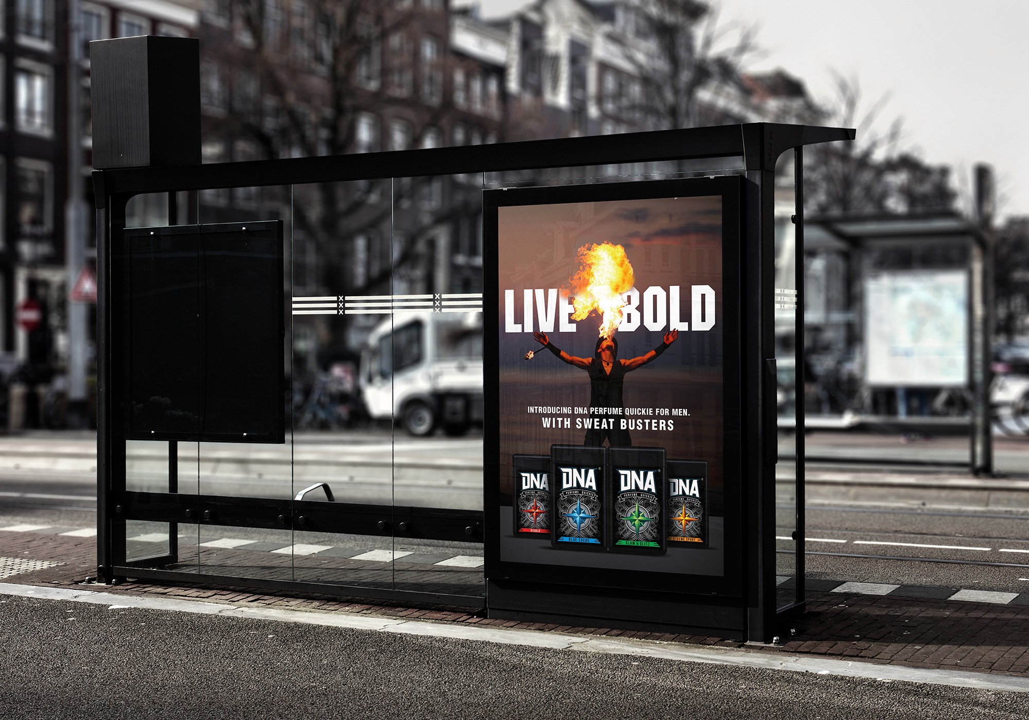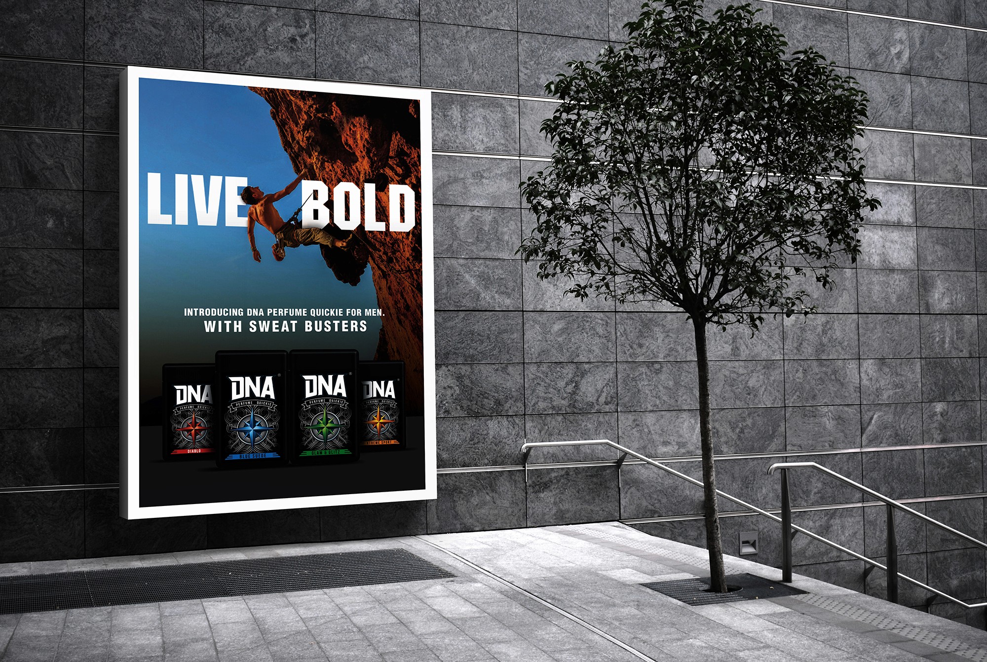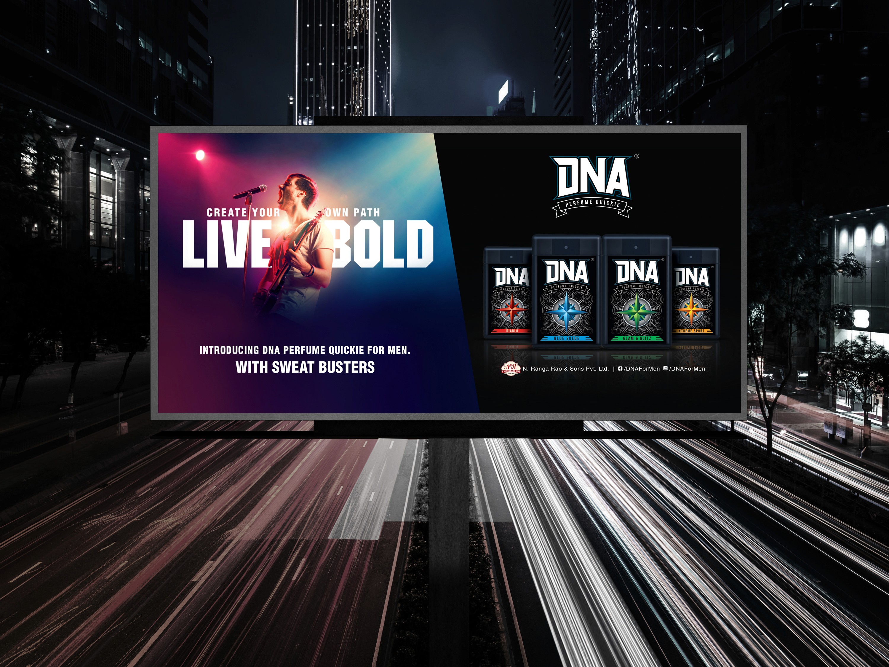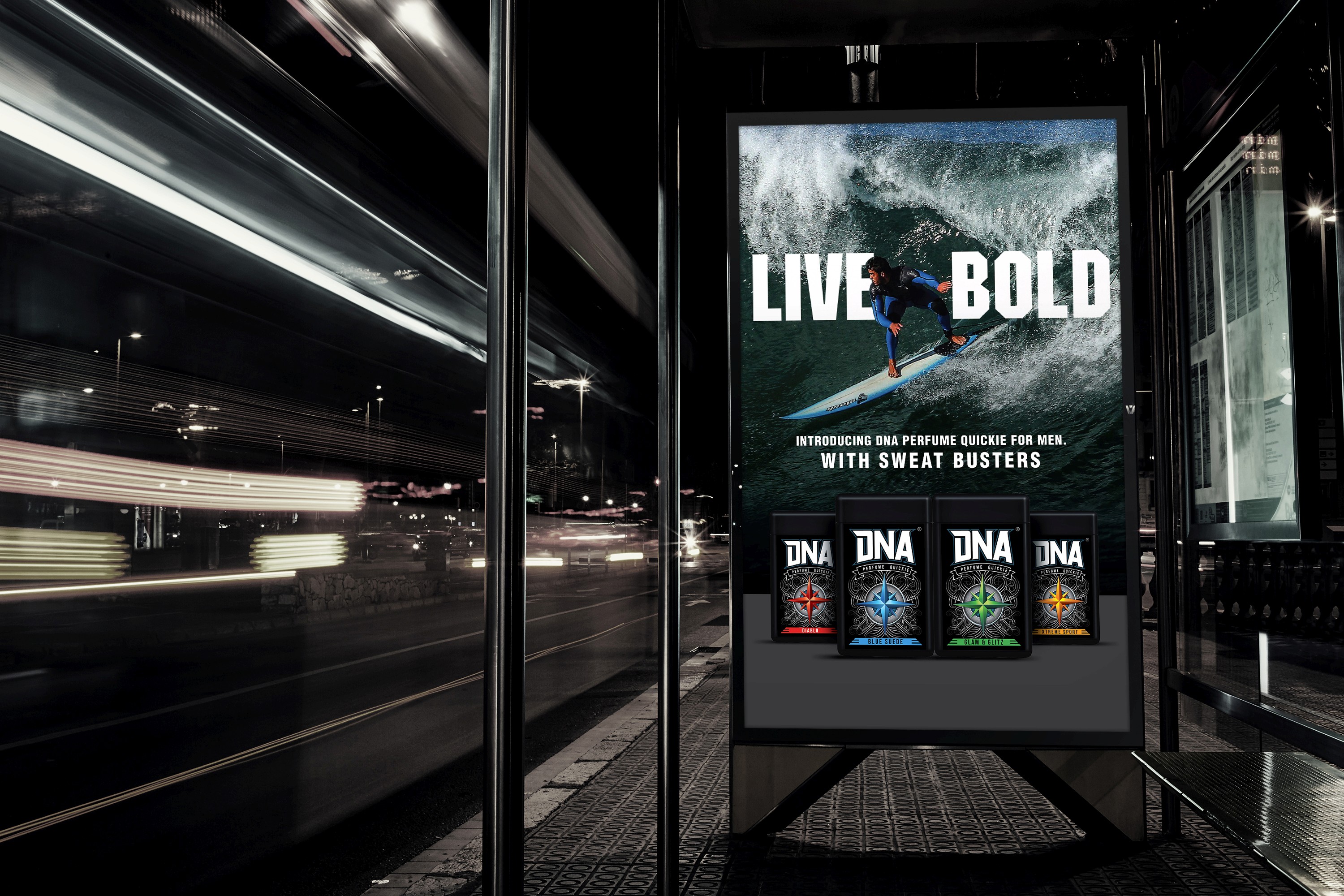 The DNA range of men's fragrance products are targeted at youth with an adventurous mindset. As a player in an extremely competitive market, there was a need to create a distinctive and impactful shelf presence. The brand name, DNA, harks to the individuality of each person, and this was encapsulated with custom-created font. The selective serif-like flourishes add an edge of dynamism and movement. The compass motif is inspired by the idea of exploration, and boldly finding one's own path. The elements of the compass also offer the opportunity for modifications to match the variants. The tag line, Live Bold, takes advantage of the impact of the Motor typeface.